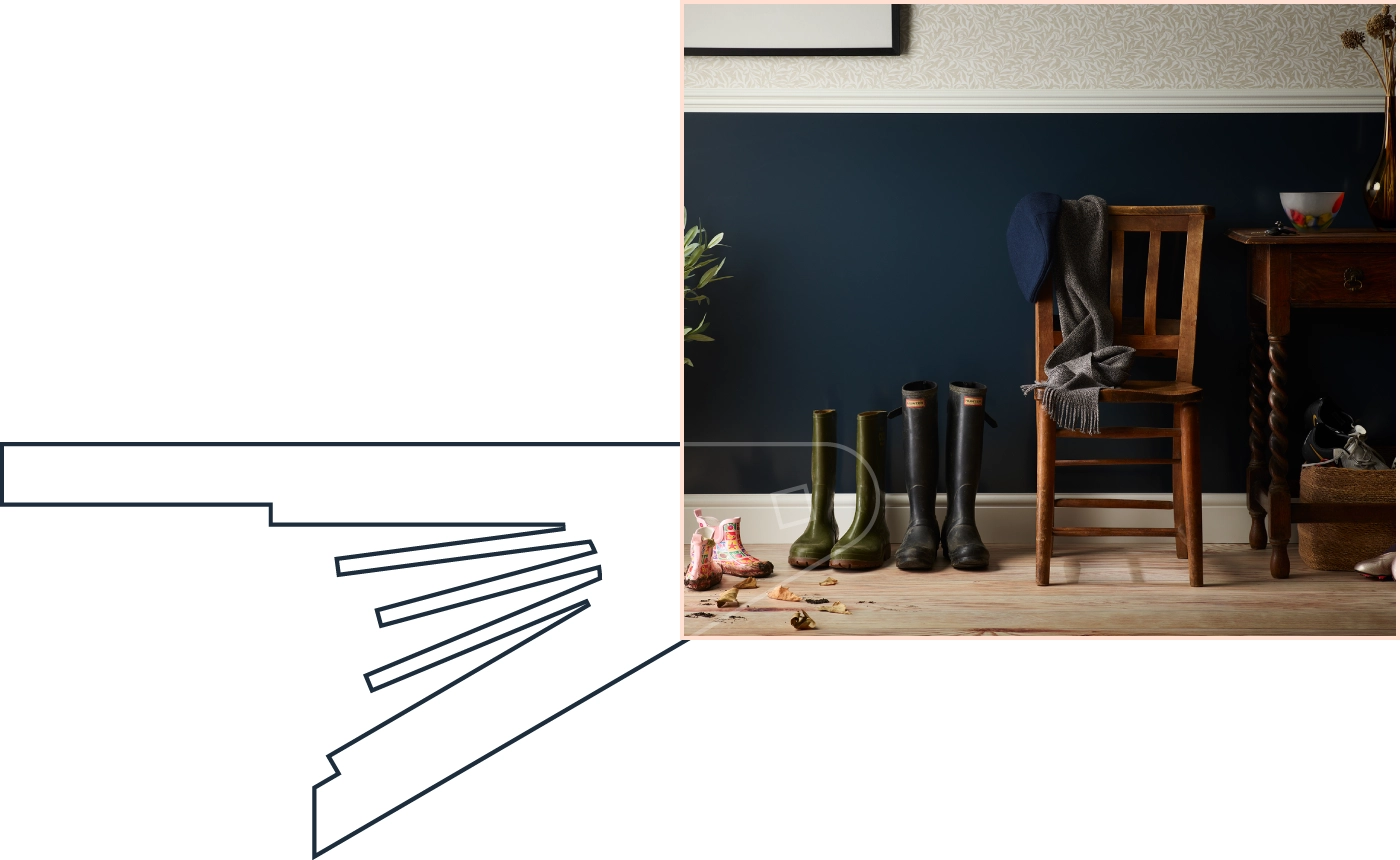 Ash and Slate are used to match floor tiles in bathrooms, shower rooms, kitchens and hallways - maybe changing halfway up the wall to allow a bright aspect above.